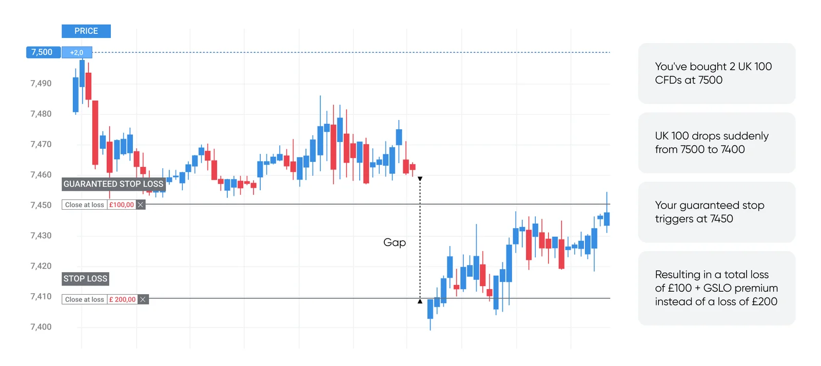 For example, during a market gap, a standard stop will typically execute at the next available price rather than the level specified. Slippage can occur in volatile markets or periods of low liquidity.  Meanwhile, a guaranteed stop-loss order, or GSLO, is a type of stop that guarantees closing a trade at a certain price, regardless of slippage or market gaps. While GSLOs can provide assurance that your trade will be executed at the price you expect, it’s important to note that they also incur a fee (premium) if triggered. Below is an example of a GSLO compared to a standard stop.