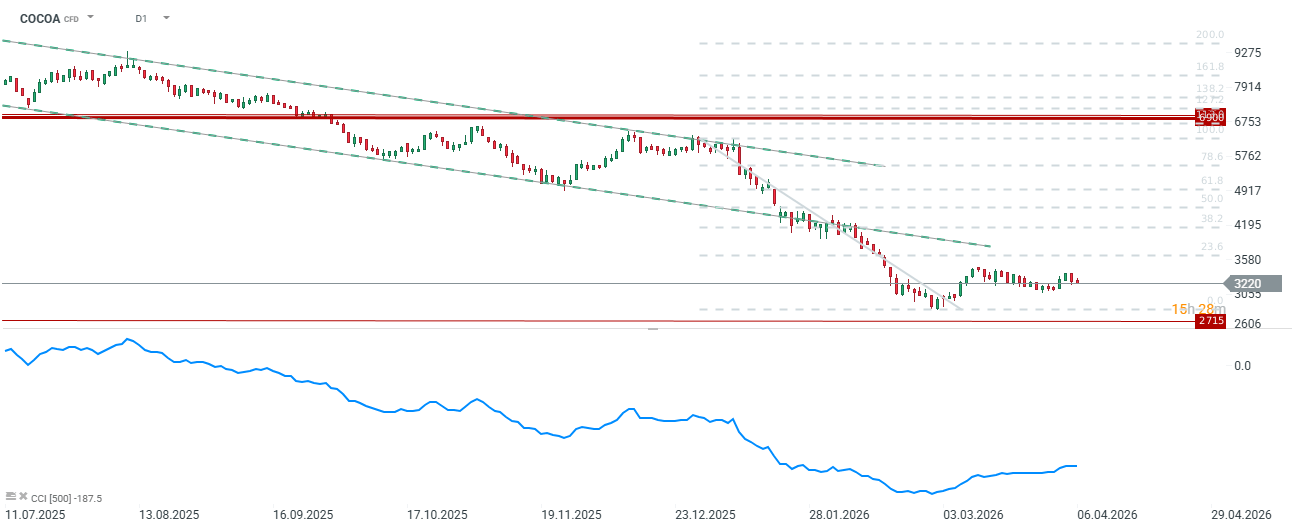 ​​​​​​​The cocoa price remains at low levels due to the lack of signs of a demand rebound. Theoretically, we should observe an improvement in the second half of this year after the exhaustion of inventories from previous years. Source: xStation5