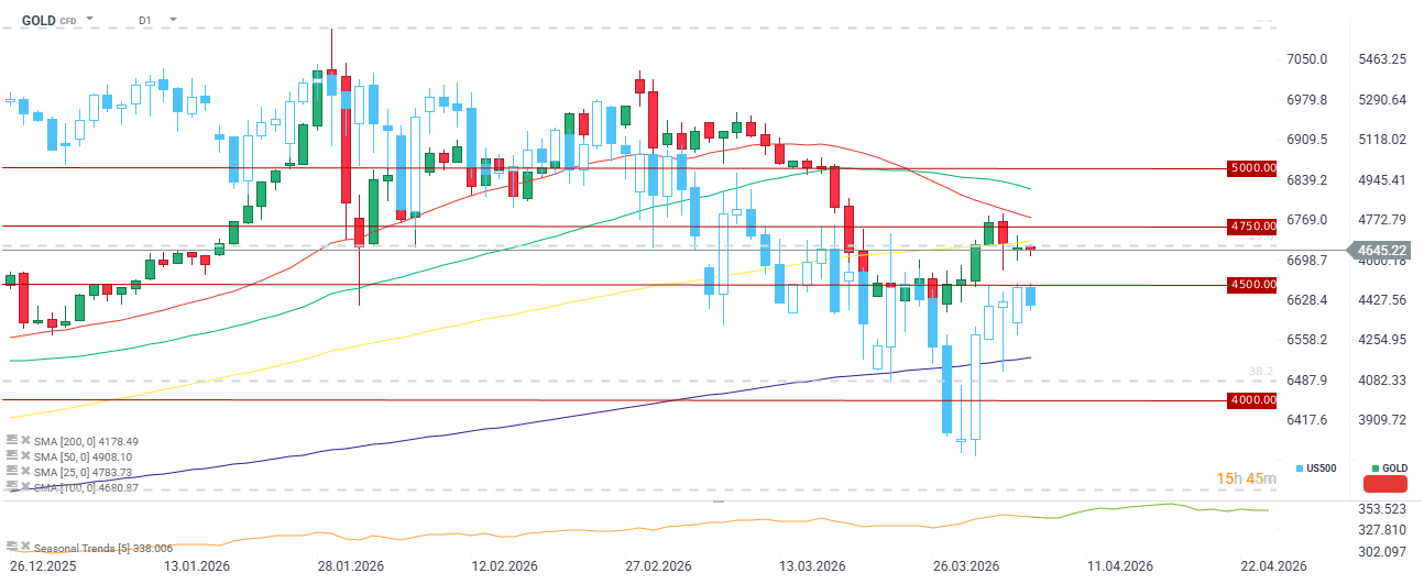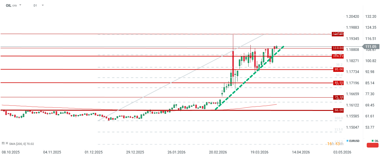 ​​​​​​​Oil is currently in a zone of strong supply and is no longer reacting as dynamically as it was a few days ago. The Strait of Hormuz remains closed, but some ships are passing through, so prices may be under slight pressure. Nevertheless, a few ships will not lead to a significant improvement in the global supply situation. Source: xStation5