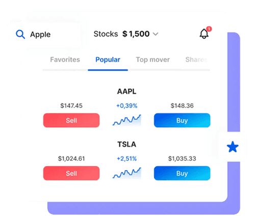 Select an asset you’d like to trade, for instance Apple CFD shares. Type the name into the search bar, or look for it in the shares list, and find out more about the price history and other useful information like financials and what analysts are saying about the stock.