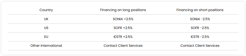 The daily financing fee will be applied to your account each day that you hold an open position (including weekend days). The financing rates are set at benchmark regional interest rate +/- 2.5%.
